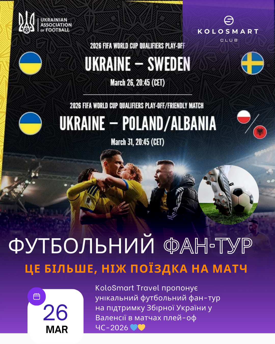 KoloSmart Travel пропонує унікальний футбольний фан-тур на підтримку Збірної України у Валенсії в матчах плей-оф ЧС-2026 💙💛